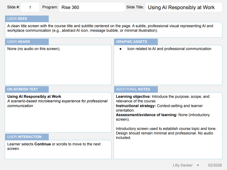 This storyboard outlines the design of a Rise 360 microlearning course on using AI responsibly in professional communication. Created in Google Slides for easy, accessible collaboration and feedback, it maps each slide’s content, interactions, and visuals as a pre-development guide, supporting collaboration with SMEs and stakeholders to ensure accuracy, relevance, and real-world applicability. The storyboard also plans scenario-based practice, interactive assessments, and supporting resources before course development.