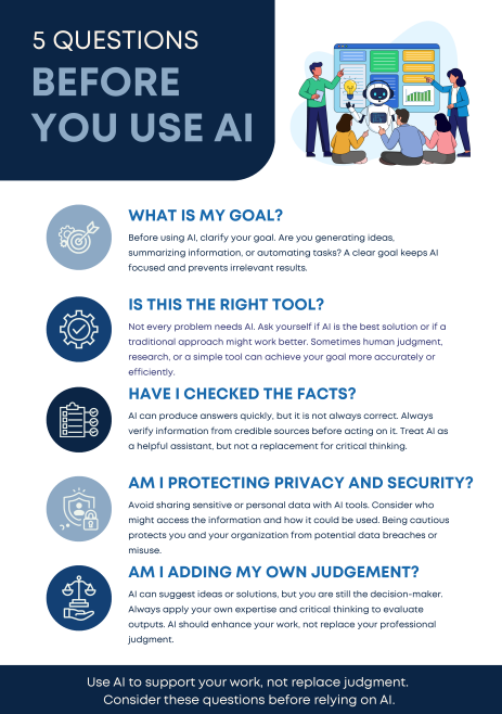 A quick-reference guide to reinforce the Using AI Responsibly at Work module. Highlights five reflection questions to help learners make thoughtful, responsible decisions when using AI in professional communication.
